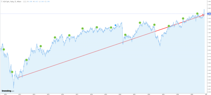Ritengo il titolo un buon investimento nel lungo termine. È infatti passato dai 38 centesimi per azione di novembre 2012, agli attuali 2,40 €, più i dividendi distribuiti di anno in anno, segnando quindi una crescita media negli ultimi 13 anni, di circa il 19% annuo.