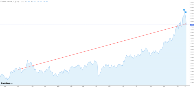 Giovedì 16 ottobre, le quotazioni dell’argento hanno segnato il nuovo massimo storico, oltrepassando il precedente massimo storico del 25.04.2011 a 49,82 dollari per oncia e portandosi fino a 53,765 U$D per oncia. Chi s’accontenta gode, dice il detto, ma noi non l’abbiamo fatto e non abbiamo venduto giovedì.