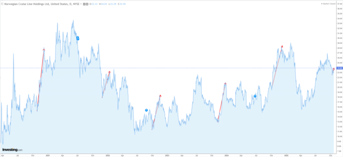 Gli investitori vedono NCLH come un titolo ciclico, adatto a chi punta su riprese economiche e crescita del turismo. Proprio la sua ciclicità, lo rende ulteriormente interessante in quanto da diversi anni registra dei minimi di prezzo versa la metà di ottobre per poi offrire dei rialzi anche del 50% in poche settimane, generalmente entro la fine dell’anno.