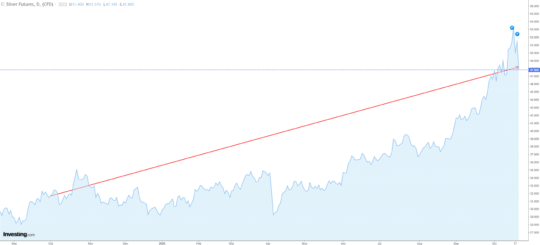 Giovedì 16 ottobre, le quotazioni dell’argento hanno segnato il nuovo massimo storico, oltrepassando il precedente massimo storico del 25.04.2011 a 49,82 dollari per oncia e portandosi fino a 53,765 U$D […]